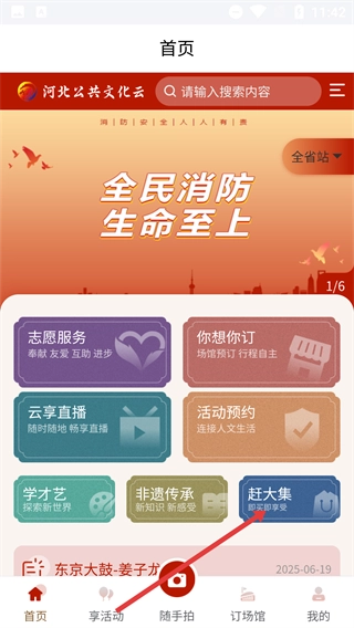 1、在【河北公共文化云】首页,点击【赶大集】功能按钮,进入该板块(此板块集合了地方文创、文旅产品等各类资源)。