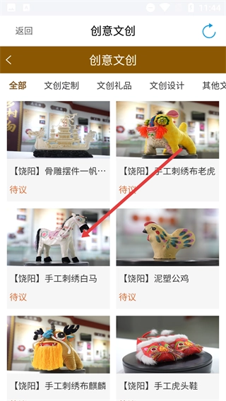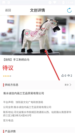 3、在创意文创列表里,挑选目标产品(例如【饶阳】手工刺绣白马),点击进入该文创产品的详情页。