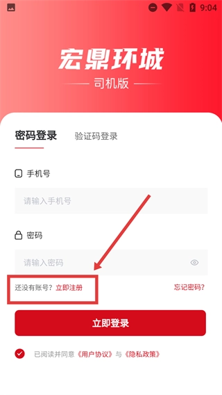 2、进入【宏鼎环城-司机版】的登录界面,选择登录方式后,要是还没有账号,就点击【还没有账号?-立即注册】按钮,页面会跳转至注册页面。
