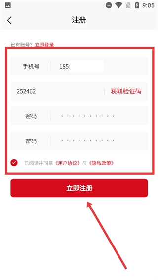 3、进入注册界面后,依次填写【号】、获取并输入【验证码】,两次设置【密码】,勾选相关协议,最后点击【立即注册】按钮,即可完成注册流程。