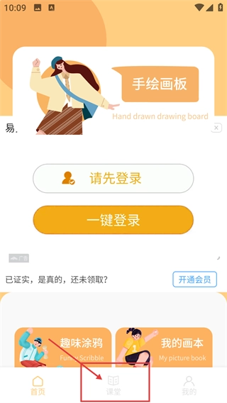 在应用首页能找到【手绘画板】的相关功能入口,点击底部导航栏的【课堂】选项,就能进入绘画教学内容页面。