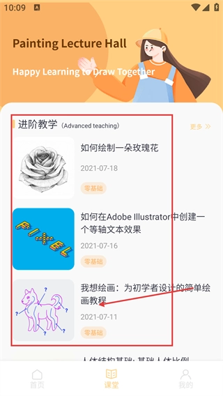 3、【课堂】页面设有【进阶教学】板块,里面提供“如何绘制一朵玫瑰花”这类零基础绘画教程,用户能依据自身需求挑选相应教程开展学习。