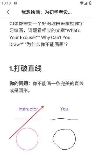 4、进入具体教程页面,能够学习基础绘画技巧,像“打破直线”这类入门内容,可帮助初学者解决绘画初期遇到的常见问题。