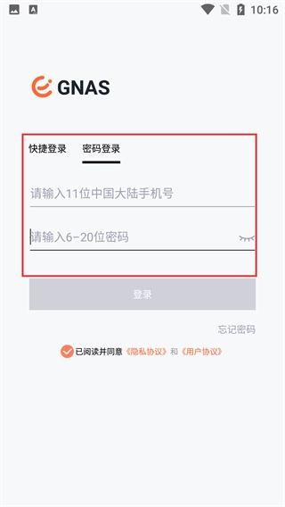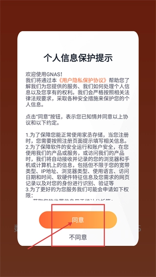 1、打开GNAS应用时,会出现【个人信息保护提示】弹窗,必须点击【同意】按钮进行确认,方可进入接下来的登录环节。