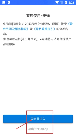 进入应用后,需阅读《软件许可及服务协议》与《隐私政策指引》,点击【同意并进入】按钮,才能使用【e电通】的相关服务。