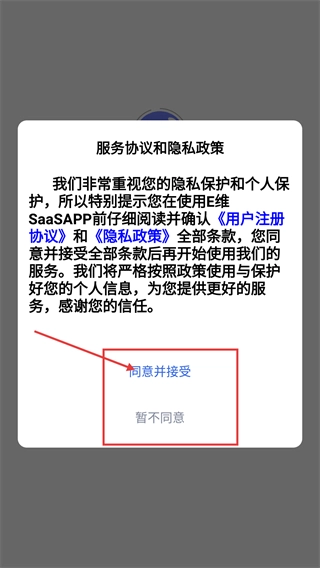 1、打开应用后,需阅读《服务协议和隐私政策》,点击“同意并接受”按钮,才能继续使用【E维SaaS-】的相关服务。