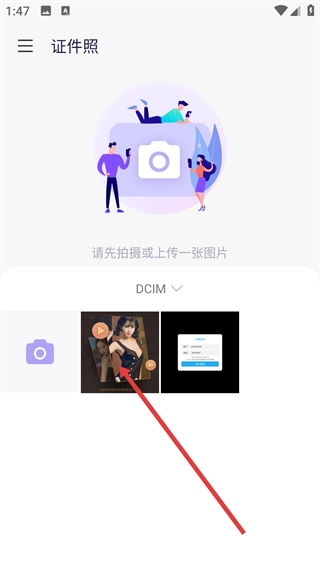 1、进入【证件照】页面,在【DCIM】目录里挑选需要处理的图片,完成初始素材的选择,为后续制作证件照做好准备。