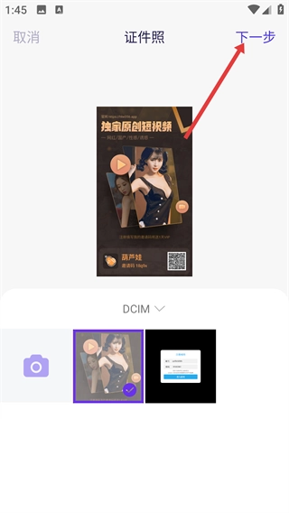2、选好图片后,点击页面右上角的【下一步】按钮,即可进入证件照的编辑和规格选择环节,继续推进制作流程。