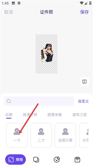 3、进入规格选择界面后,找到并点击【一寸】选项,选定此证件照尺寸,这样就能匹配对应的制作参数。