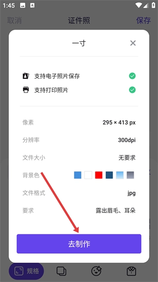 4、在确认【一寸】证件照的参数(例如295×413像素)后,点击【去制作】按钮,即可启动证件照的生成流程。