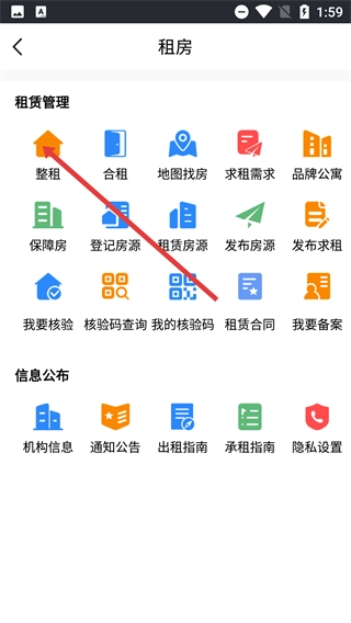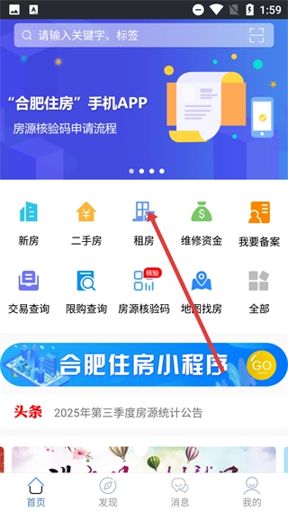 1、在【合肥住房-】首页,点击功能栏里的【租房】选项,进入租房模块页面,进而开展房源相关的操作流程。