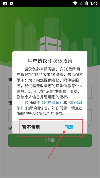 进入应用后,需阅读《用户协议》与《隐私政策》,在了解个人信息收集规则后,点击“同意”按钮,才能使用“e施工”的相关服务。