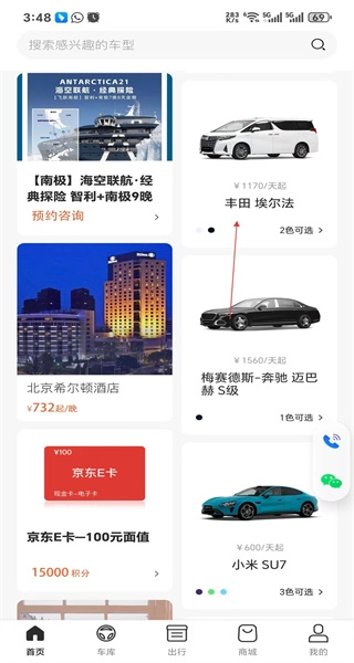 4、回到首页后点击车库按钮,浏览各类车型与套餐信息,挑选感兴趣的车型查看其详细内容。