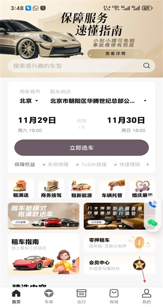 打开软件后,首页设有保障服务与车型相关的板块,点击底部的“我的”按钮,即可进入对应的个人操作页面。