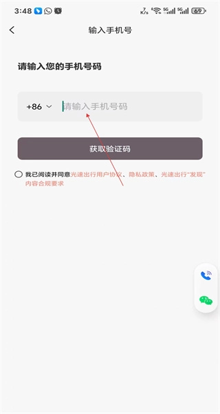 3、进入号码输入页面,输入号码并勾选相关协议内容后,点击获取验证码按钮。