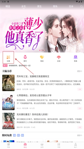 1、点击【分类】按钮,进入小说分类页面,筛选目标题材(如女生、男生等)。