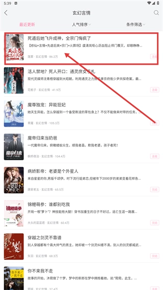 2、在分类页面选择小说(例如《死后通关飞升成神,全部门阀疯了》),进入该作品的详情页面。