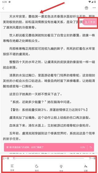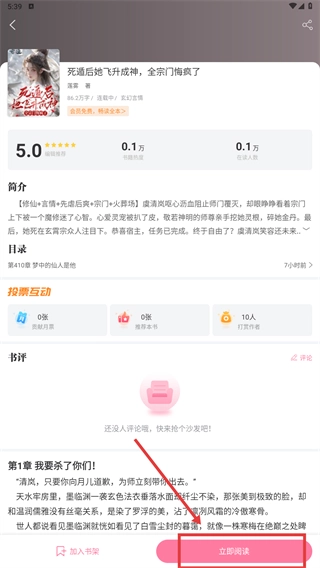 3、在详情页点击【加入书架】按钮,即可完成作品收藏;点击【立即阅读】按钮,则能进入小说阅读界面。