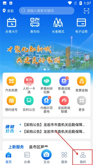 1、在应用首页底部导航栏找到并点击【我的】选项,即可进入个人中心界面。这款应用是龙岩本地的综合服务平台,能为用户提供办事、交通等多方面的功能服务。