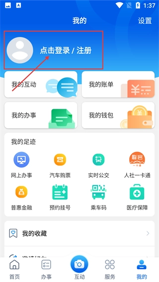 2、在个人中心页面,点击【点击登录/注册】的区域,进入账号登录或注册的流程,完成操作后就能使用个人相关的服务功能。
