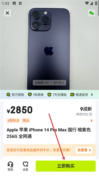 4、在商品详情页核对好相关信息后,点击【立即购买】按钮,即可进入商品的下单与支付环节。