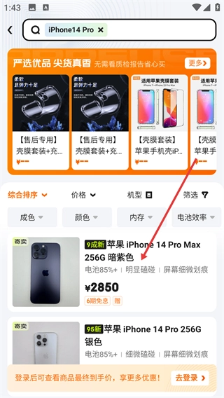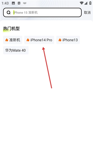 2、在搜索界面选择热门机型标签(例如【iPhone14Pro】),就能快速定位到对应商品的搜索结果列表。