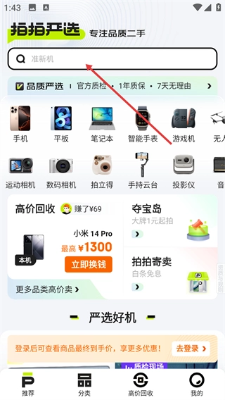 1、在首页点击顶部的搜索框,输入想要查找的商品关键词,就能搜索到对应的二手数码产品;此外,还可以通过分类入口来筛选具体的品类。