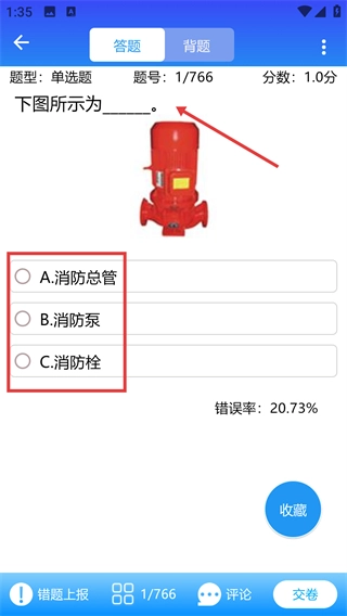 4、在答题界面阅读题目后选择对应的选项(本题正确选项是B.消防泵),完成这道题的作答。