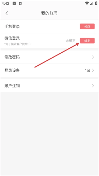 4、在账号管理页面找到【微信登录】选项,点击其右侧的【绑定】按钮,即可完成微信与该账号的关联绑定操作。