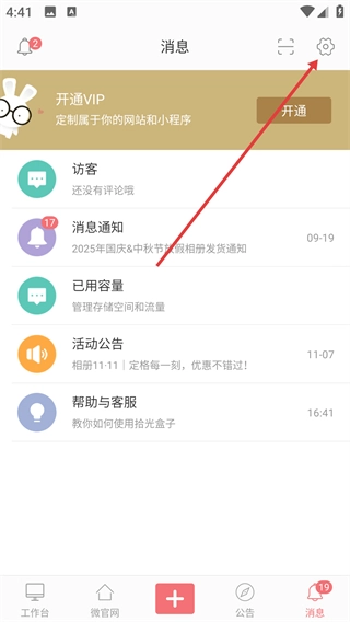 2、在消息页面点击右上角的【设置】按钮,即可进入消息相关的系统设置界面。