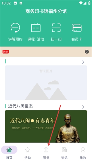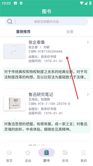 1、在主界面点击底部的【图书】选项,即可进入图书资源页面,查看推荐书籍列表。