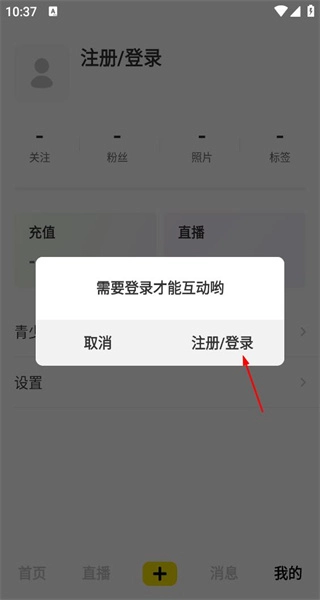 3、弹出提示框,提示需登录后才能进行互动,并提供“取消”和“注册/登录”两个操作选项。