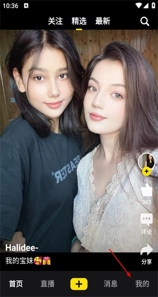 1、打开软件后,进入精选页面,这里会展示用户发布的内容,同时配有点赞、评论和分享按钮;之后选择“我的”,即可进入对应的个人页面。