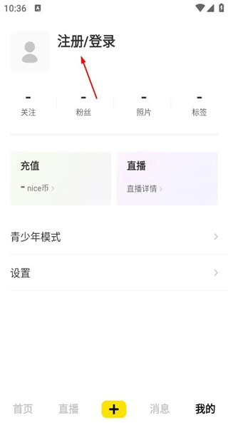 2、进入“我的”页面,顶部设有注册登录按钮,下方排列着关注、粉丝等统计项目,点击该注册登录按钮。