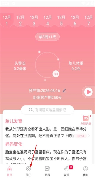 打开软件后,会呈现孕期进度和胎儿发育相关信息,包括孕周等内容,用户可选择圈子进入对应的功能页面。