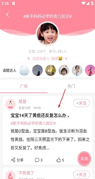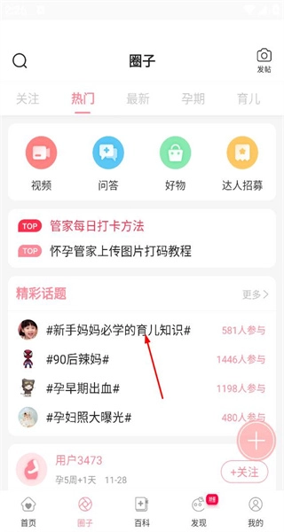 2、进入圈子页面后,页面会呈现热门分类与精彩话题,从中选择“新手妈妈必学的育儿知识”这一话题,即可进入该话题的详情页面。