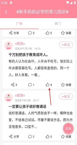 4、继续浏览话题内的育儿帖子,点击点赞按钮,完成与该育儿分享内容的互动操作。