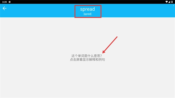 2、进入单词学习页面后,找到【spread-单词】并查看,点击屏幕即可显示该单词的释义和例句。