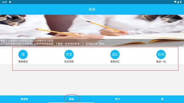 4、点击底部的【阅读-功能按钮】,进入阅读页面后,能够选择【常用语句】等分类进行学习。
