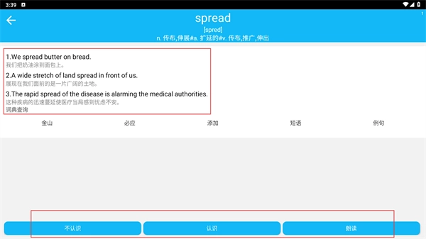 3、在查看单词的释义和例句后,可通过点击【不认识】【认识】【朗读】按钮来标记对应的学习状态。