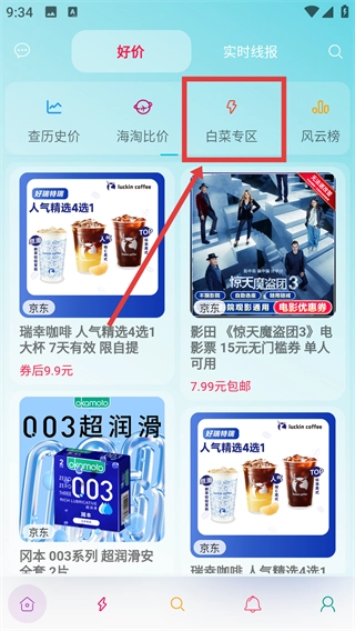 1、点击界面上的【白菜专区】选项,进入对应的特价商品专区,就能查看该专区里的各类优惠商品信息,像饮品、电影券之类的。
