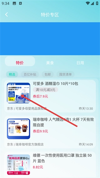 2、在【特价专区】页面找到目标商品,例如【可爱多-酒精湿巾-10片*10包】,点击该商品卡片进入其爆料详情页面。