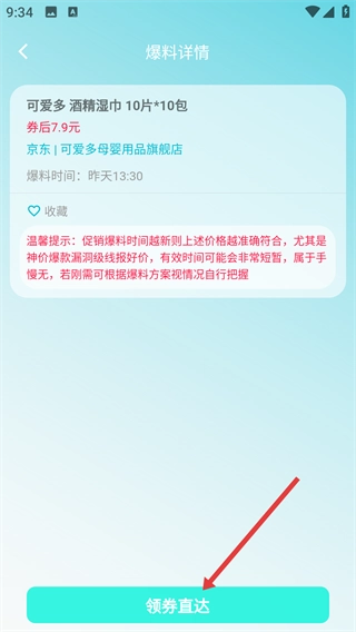 3、在【爆料详情】页面查看商品信息后,点击底部的【领券直达】按钮,即可进入对应的领券页面领取商品优惠。