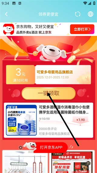 4、在领券页面找到【满10元可用的3元优惠券】,点击【一键领取】按钮,完成领取后即可享受该优惠。