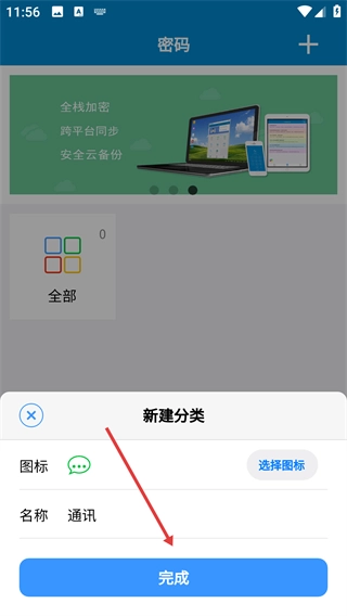 3、在新建分类页面挑选图标、输入分类名称(例如【通讯】),点击【完成】按钮来确认创建。