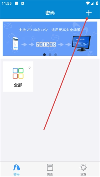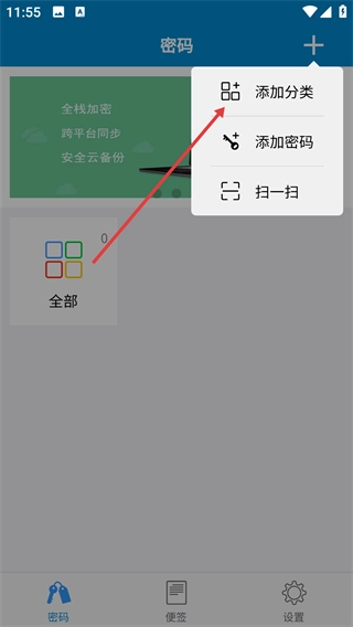 1、进入密码管理界面后,点击右上角的“+”按钮,随即会弹出功能操作选项菜单。
