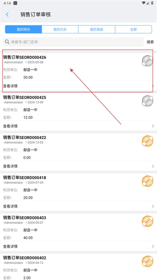 3、在销售订单审核界面,选中目标订单条目并点击,即可进入该订单的详情页面。