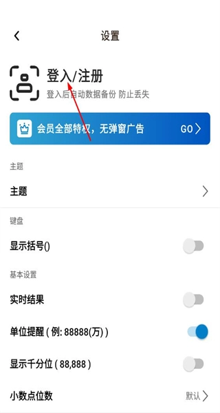 2、打开软件的设置界面,查看登录注册、主题、键盘等设置选项,点击“登录注册”进入对应的登录方式选择页面。