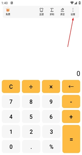 1、启动软件后,可看到计算按键以及顶部的主题等功能按钮,点击设置按钮即可进入相应的设置操作界面。