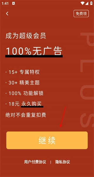 4、进入超级会员页面,查看等特权以及购买相关信息,点击继续按钮以推进该页面的后续操作流程。